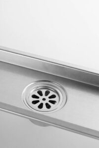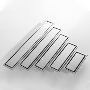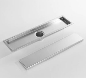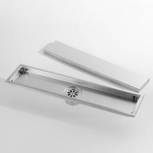يتميّز المصرف بإمكانية **تثبيت قطعة من نفس نوع أرضية الحمام أو المطبخ على الغطاء العلوي**، بحيث يندمج تمامًا مع الأرضية دون أن يظهر، ليمنح مظهرًا أنيقًا ومتناغمًا يخفي المصرف بشكل ذكي وفخم.